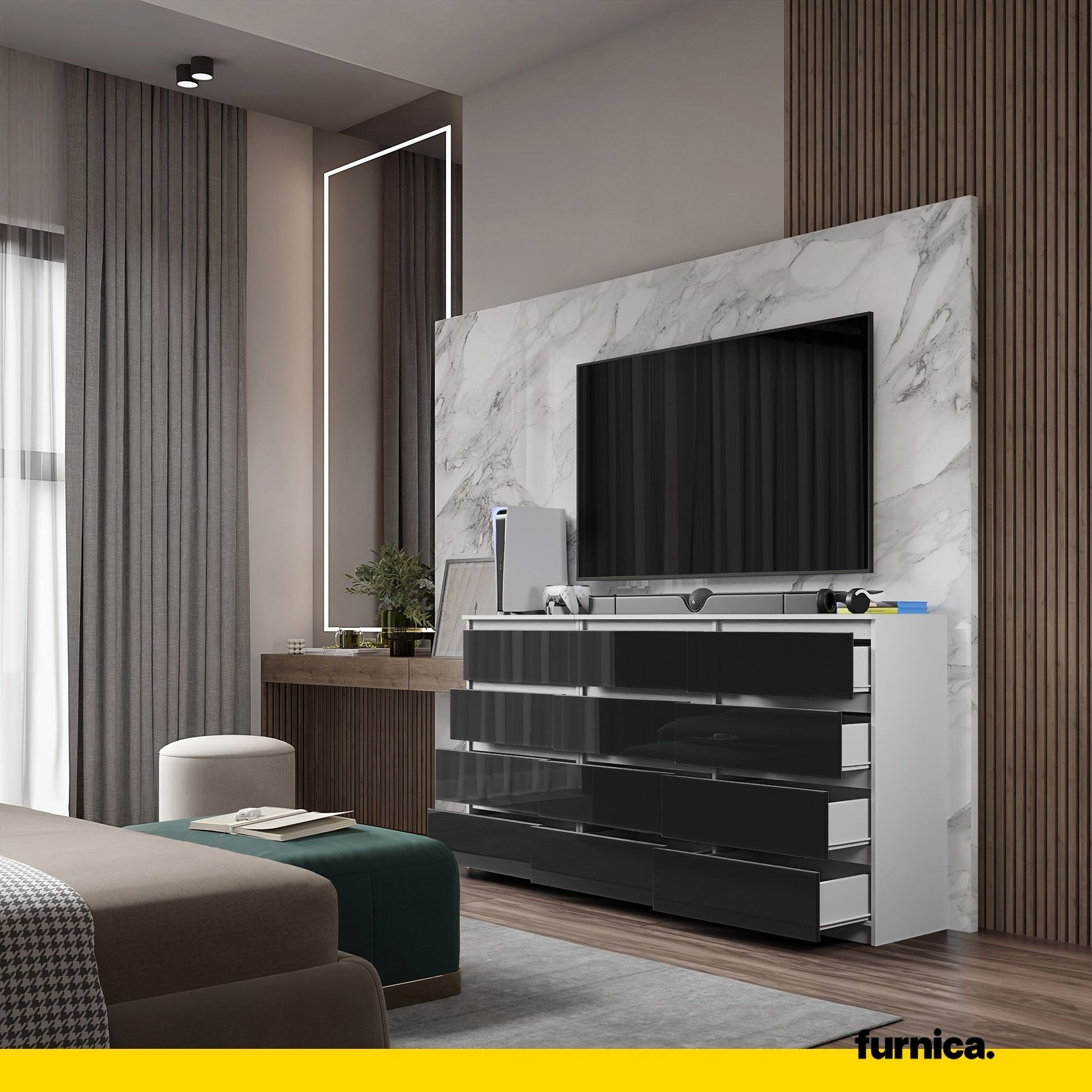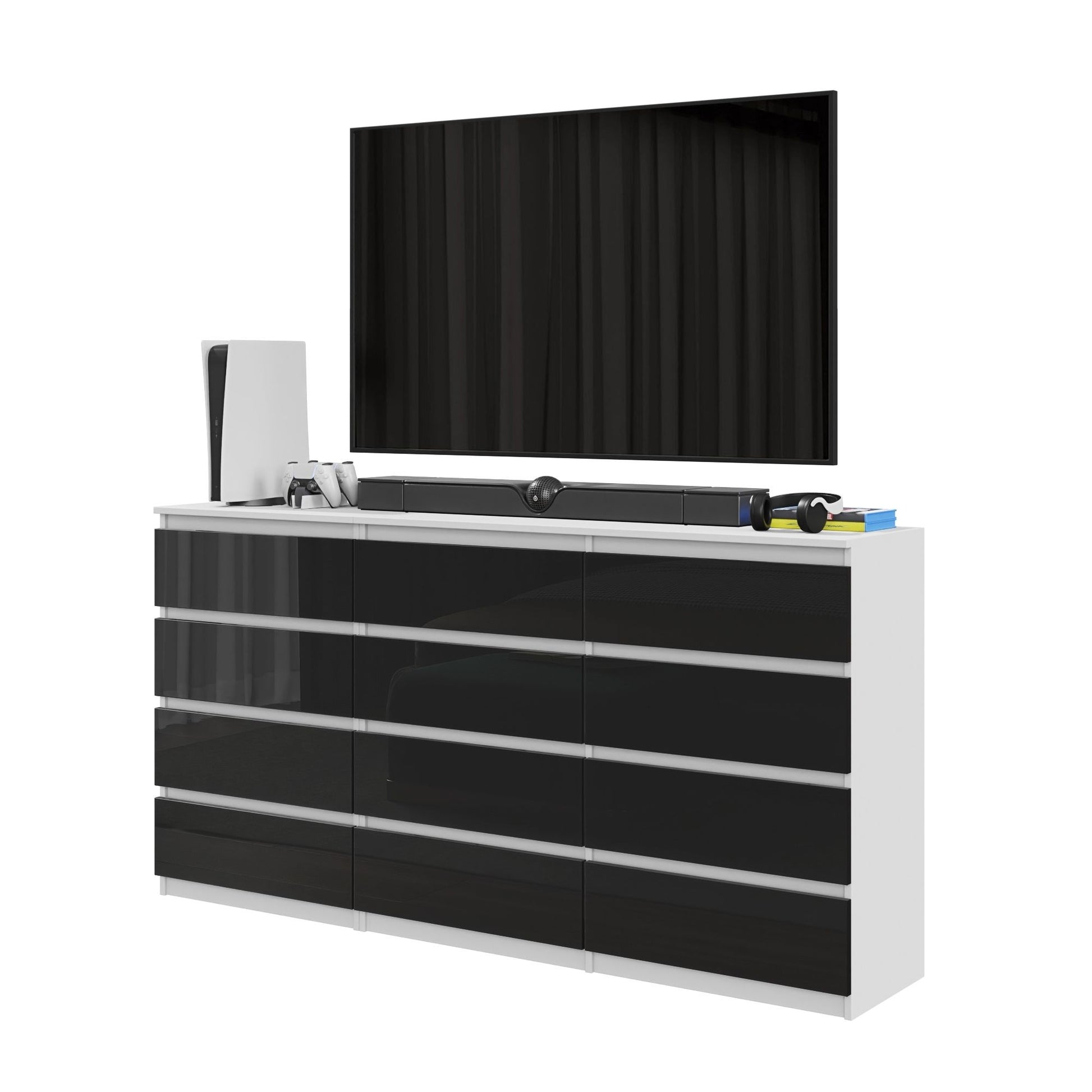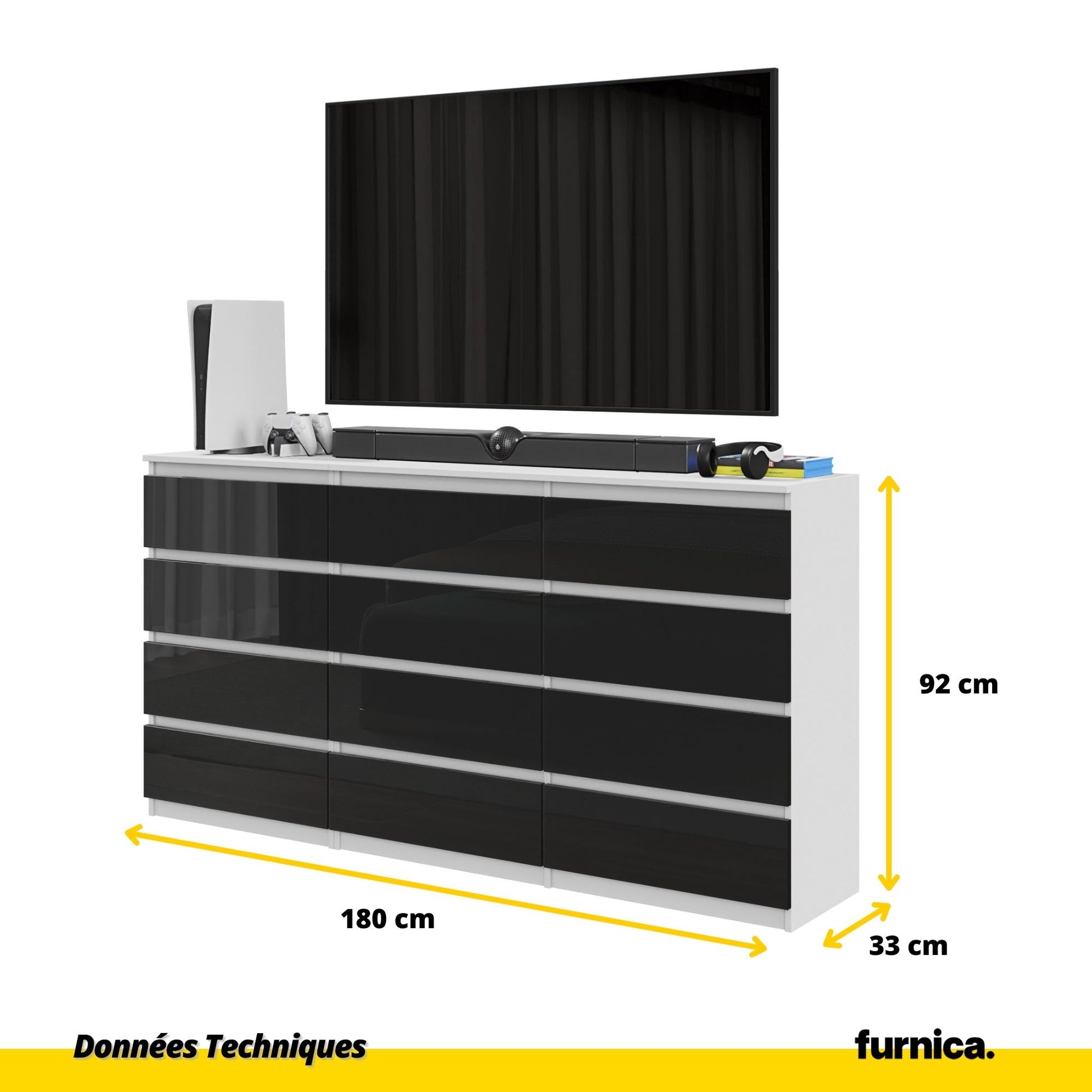 Caractéristiques techniques: Commode 12 Tiroirs (8+4) - H92cm L180cm P33cm (Blanc / Noir Brillant)