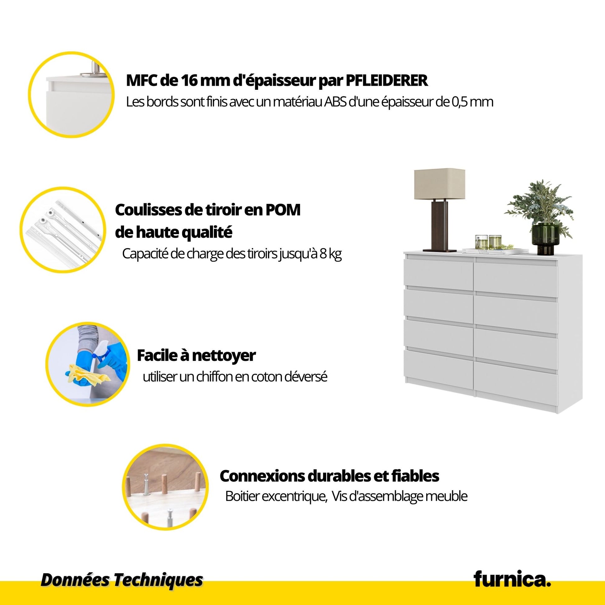 Pensées pour les petits espaces, les commodes étroites sont irremplaçables pour organiser chaque espace. Nous les livrons à votre porte et en quelques instants vous les assemblez en un meuble beau et fonctionnel qui vous servira longtemps. Nous avons veillé à ce que les tiroirs s'ouvrent sans effort, quelle que soit la quantité de choses que vous y mettez, et à ce que toutes les surfaces soient résistantes aux rayures et extrêmement faciles à nettoyer.