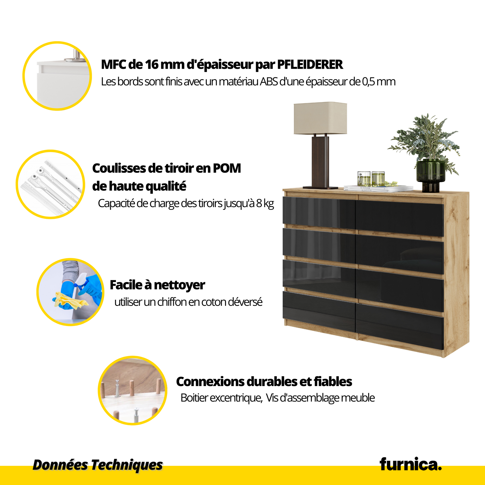 Nous savons que le maquillage se répand sur une commode, que les tasses de café du matin laissent des cercles partout et qu'il ne faut pas se préoccuper des taches lorsqu'il y a des choses bien plus importantes à faire. Laissez vos clés sur le buffet de l'entrée et ne vous préoccupez pas de la laisse sale de votre chien après la promenade. La finition Kronospan est durable et résistante aux rayures, et tout ce dont vous aurez besoin pour la nettoyer, c'est d'un chiffon doux et humide.