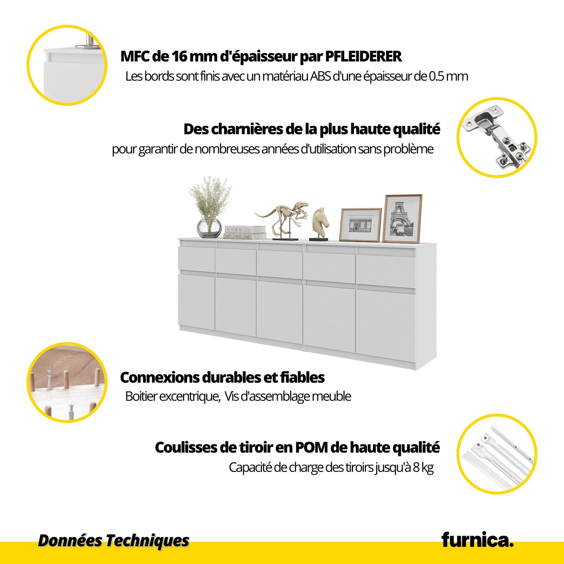 Si vous avez besoin d'un nouveau meuble pour votre maison et que vous êtes à la recherche d'une commode pratique, nous avons quelque chose qui pourrait vous intéresser. Notre buffet fonctionnel a été fabriqué à partir d'un solide panneau de particules de mélamine de 16 mm d'épaisseur et d'un panneau de fibres haute densité sur le dessus. Cela signifie que la construction de vos grands meubles sera solide, durable, stable et totalement sûre. Une commode aussi utile mesure 75 cm de haut, 200 cm de large et 35 cm de profondeur.